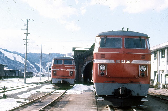 毎度のことですが、いつの頃の写真か分かりません。DD54が5両写っていますが、この中でDD5437は1974.4に米子から福知山に来て77.1に廃車されるまで在籍しました。他の写真もこの期間で矛盾がありませんので時期は1974年から77年までの間と思われます。