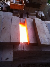 窯の後ろの煙道のレンガを1本抜くと、引きが押さえられて窯は還元状態になります。