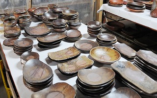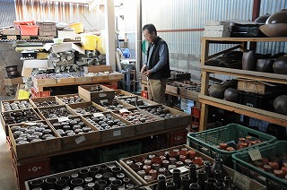 焼き物通りをぶらぶらしていると、「窯出し作品展示中」の貼り紙が。ついつられて裏に回りました。木箱に入った作品の山。