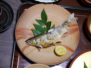 夕食には備前焼の食器がいくつか使われていました。近くに漁港もあり、海と山の食材を使ったお料理をおいしくいただきました。