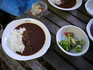 カレーとサラダ。山で食べると何でもおいしく感じます。