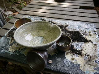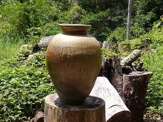 出したばかりの大壺を丸太の上に置いてみました。自然の中に溶け込んでいい景色です。