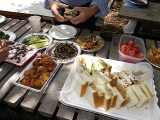 窯出しの後のお楽しみ。主食はサンドイッチとお赤飯。おかず多数。ごちそうさま。