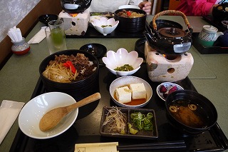朝食は+200円で「伊賀牛ひつまぶし」に変えられます。せっかくなので挑戦しました。1杯目はそのまま、2杯目は薬味を入れて、3杯目は出汁をかけていただきました。満腹。