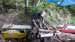 幸い近場で丸太をいただけることが多いので、軽トラで運んで、45㎝に玉切りまでしておきます。それを、電動とエンジンの2台の薪割り機を使って割り、運び、積みます。