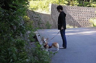 Nさんと初めての散歩。ふり返りながらいそいそと出かけました。