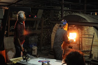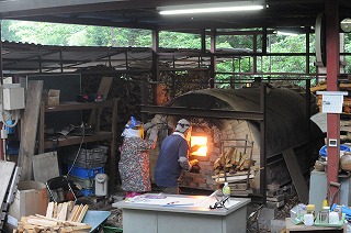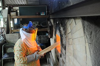 Kさんが一人で窯焚きです。このくらいになると、焚き口に薪を近づけただけで燃え始めます。