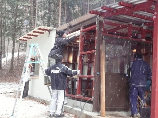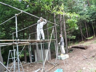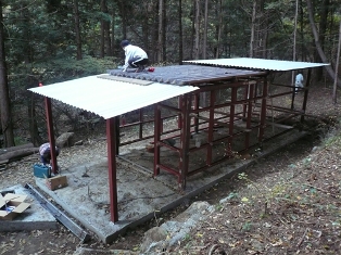 佐藤様、岩島様に来ていただき、パイプを使って第1薪小屋が完成しました。これまで野積みに近い状態だった薪が、しっかりと保管できるようになりました。