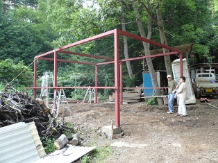 6ヵ所の基礎の上に鉄骨を組んで、屋根を載せました。この下に窯を造ります。