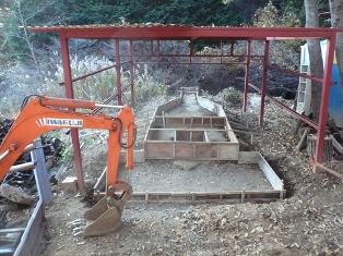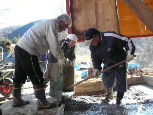 窯の基礎コンクリートを打ちました。3.5立米の半練りに水と凍結防止剤を加え、手で練って流し込みました。