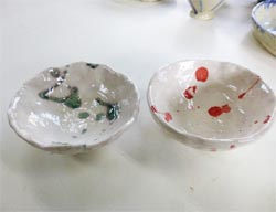 小学校6年生が卒業を前に陶芸に取り組みました。中心の絵付けと縁取りが見事です。