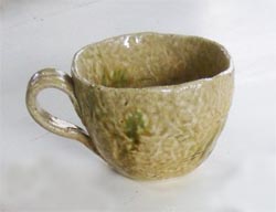こちらは手付きのカップと小皿です。緑色にということで、皿の方は縁でふちどりをしてみました。