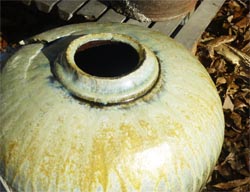 薪窯で4日間焼いて出したばかりの大壺です。降った灰が溶けてなかなかいい感じですが、残念ながら亀裂が入っています。大物ほど無傷で焼くのは難しいようです。