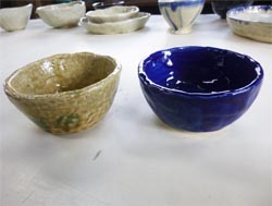 ペアの小鉢です。体験だと2時間でこのくらいのものが2個作れます。ご希望で、黄瀬戸釉と瑠璃釉で仕上げました。
