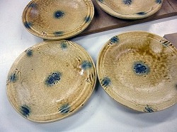 手前の皿は土灰釉です。木を燃した灰を使います。仕上がりは淡い青緑で、一番人気のある釉薬です。